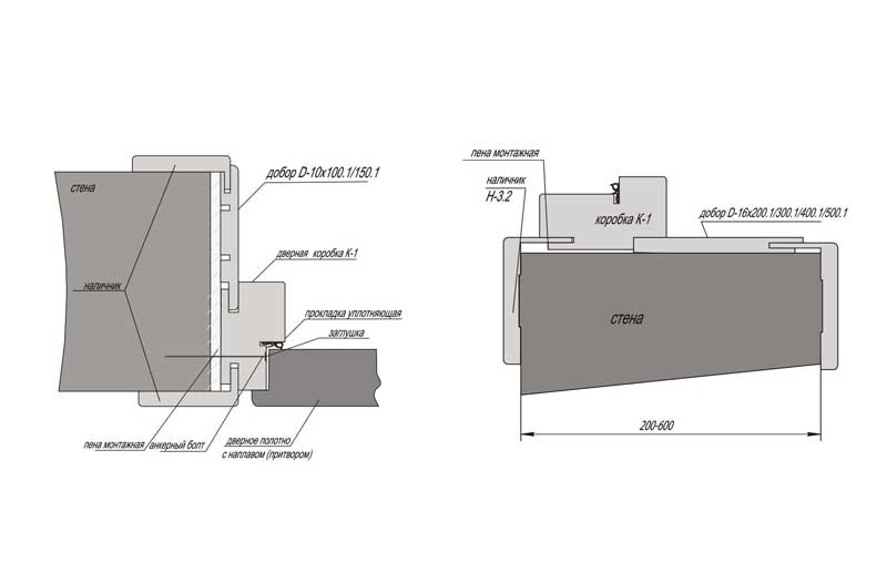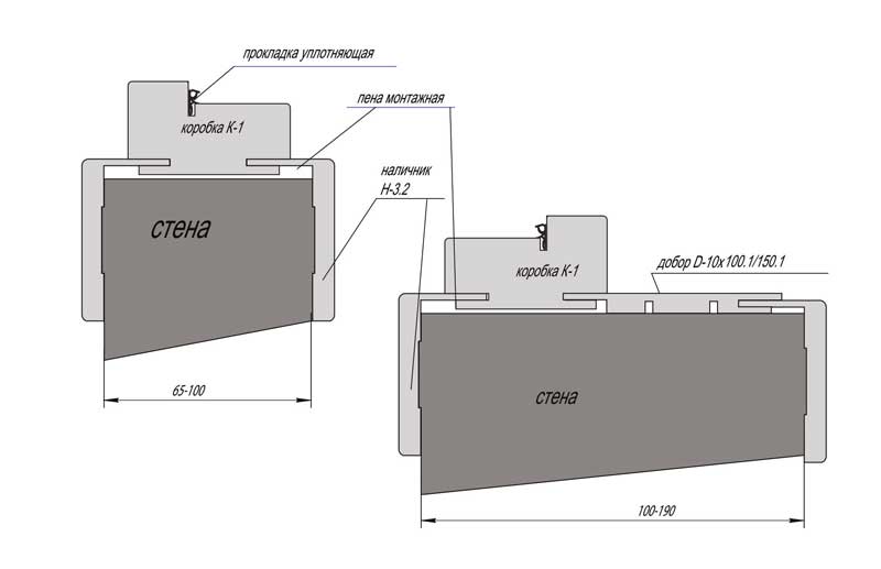 Внимание!Больший размер в каждой схеме указан для варианта установки с максимальным выдвижением крыла наличника.Открывание двери при этом возможно на угол не более 100-120 гр. (необходима установка ограничителя)